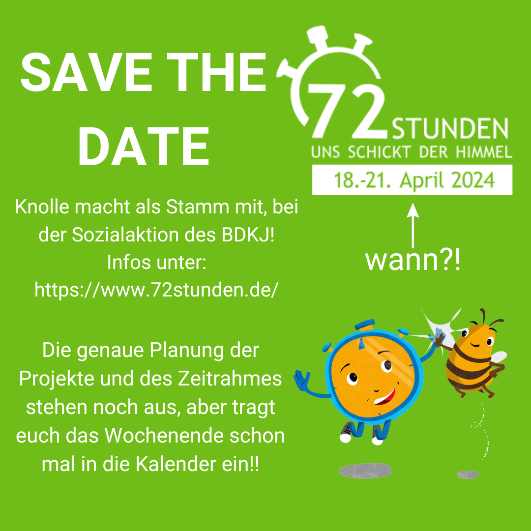 Am 18. bis zum 21. April 2024 wird die "72-Stunden-Aktion" stattfinden. Die 72-Stunden-Aktion ist eine Sozialaktion des Bundes der Deutschen Katholischen Jugend (BDKJ) und seiner Verbände. In 72 Stunden werden dabei in ganz Deutschland Projekte umgesetzt, die die „Welt ein Stückchen besser machen“.